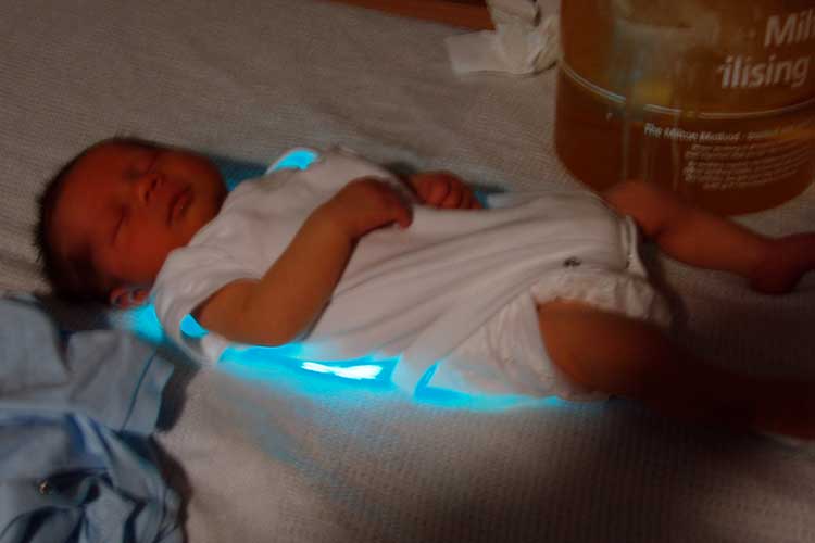 يُوضع الطفل مكشوفًا (قد يُغطى فقط بالحفاضة) تحت المصابيح، مع تغطية العيون بواسطة واقٍ مناسب.